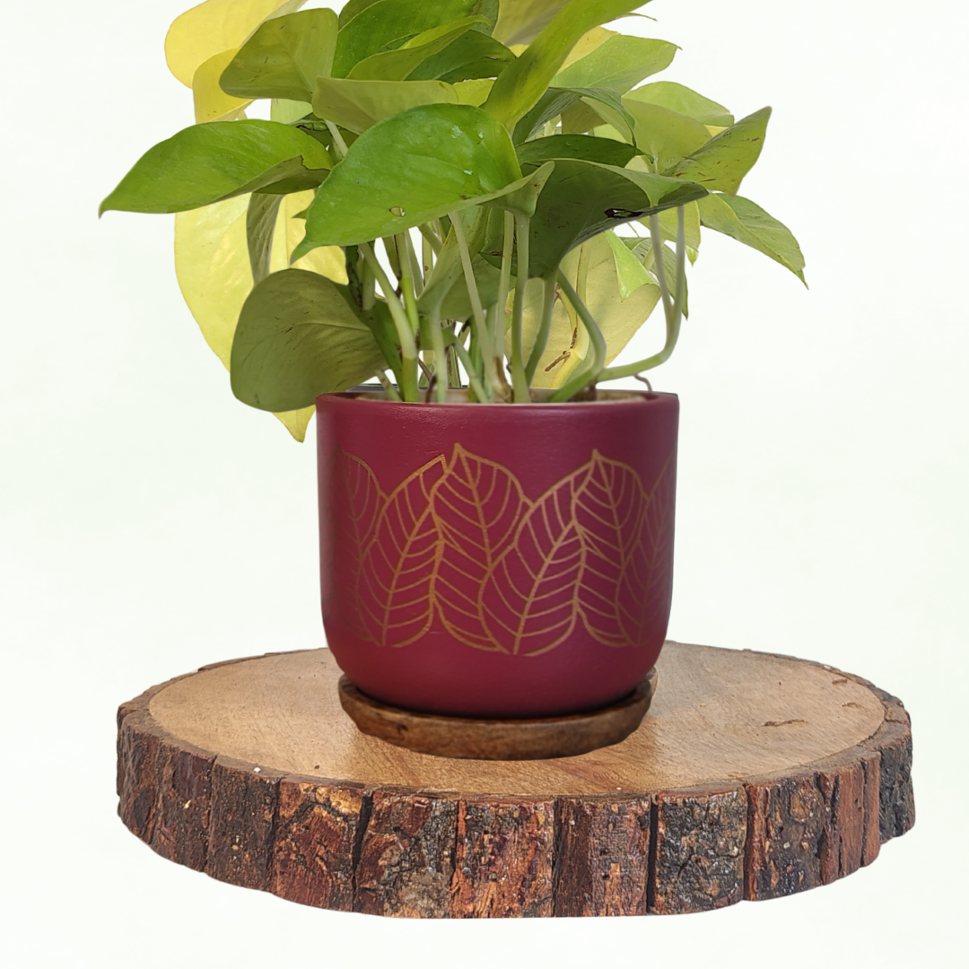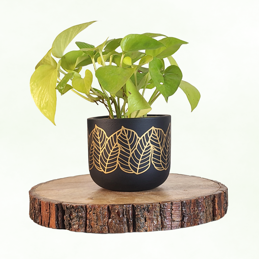 The Kyna Leaf Noir Terracotta Pot combines natural charm with a touch of luxury. Featuring a bold gold leaf design, this stylish planter adds a modern and artistic vibe to your plant décor.